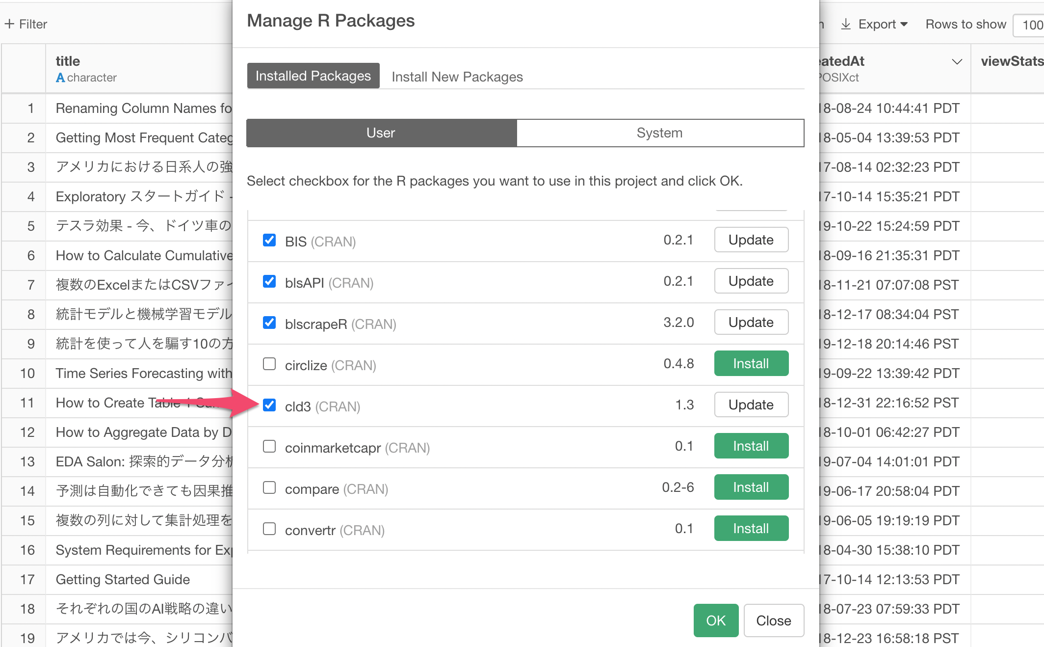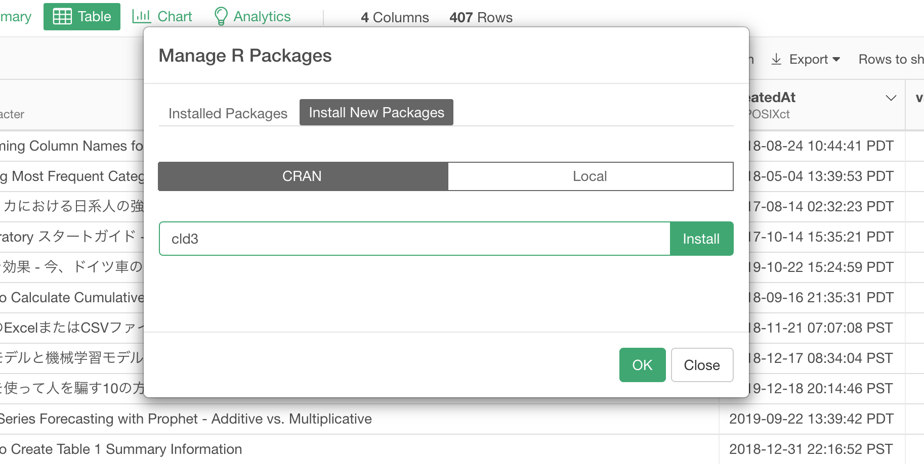 Type the package name 'cld3' under 'Install New Packages' tab and click the 'Install' button.
