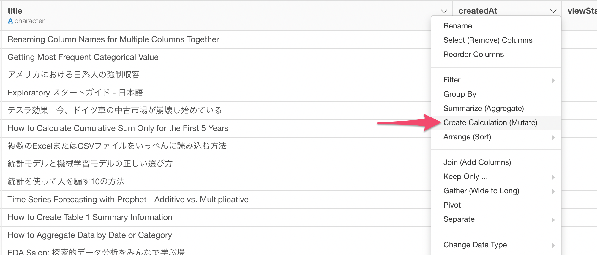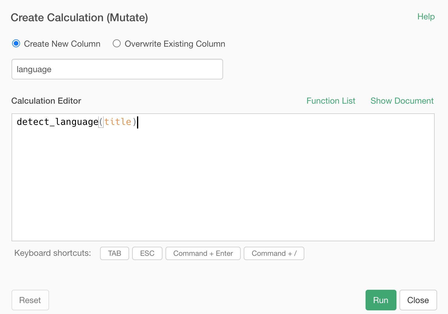 Select 'Create Calculation (Mutate)' from the column header menu of the column you want to detect the language for.