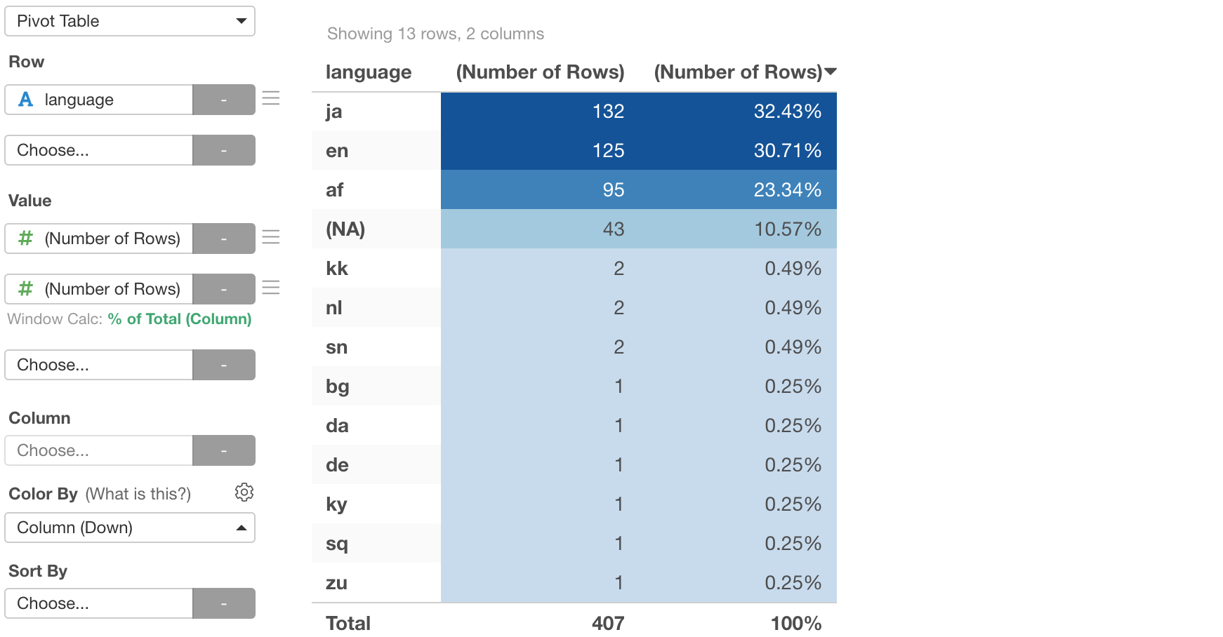 For example, there are 95 titles (23%) that are identified as 'af (afrikaans)' and 43 titles (10%) couldn't be identified.