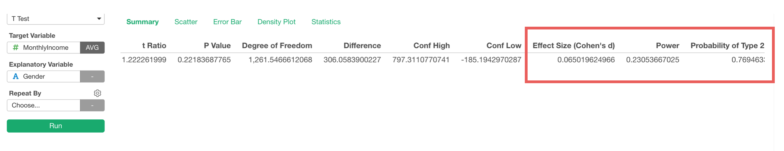 Now, the above result is showing P-value is 22% (0.22) and we are not sure if that means ‘statistically significant’ or not. And when we look at Power, it is 23% (0.23), which means that there is 77% of chance that we might be making the type 2 error.