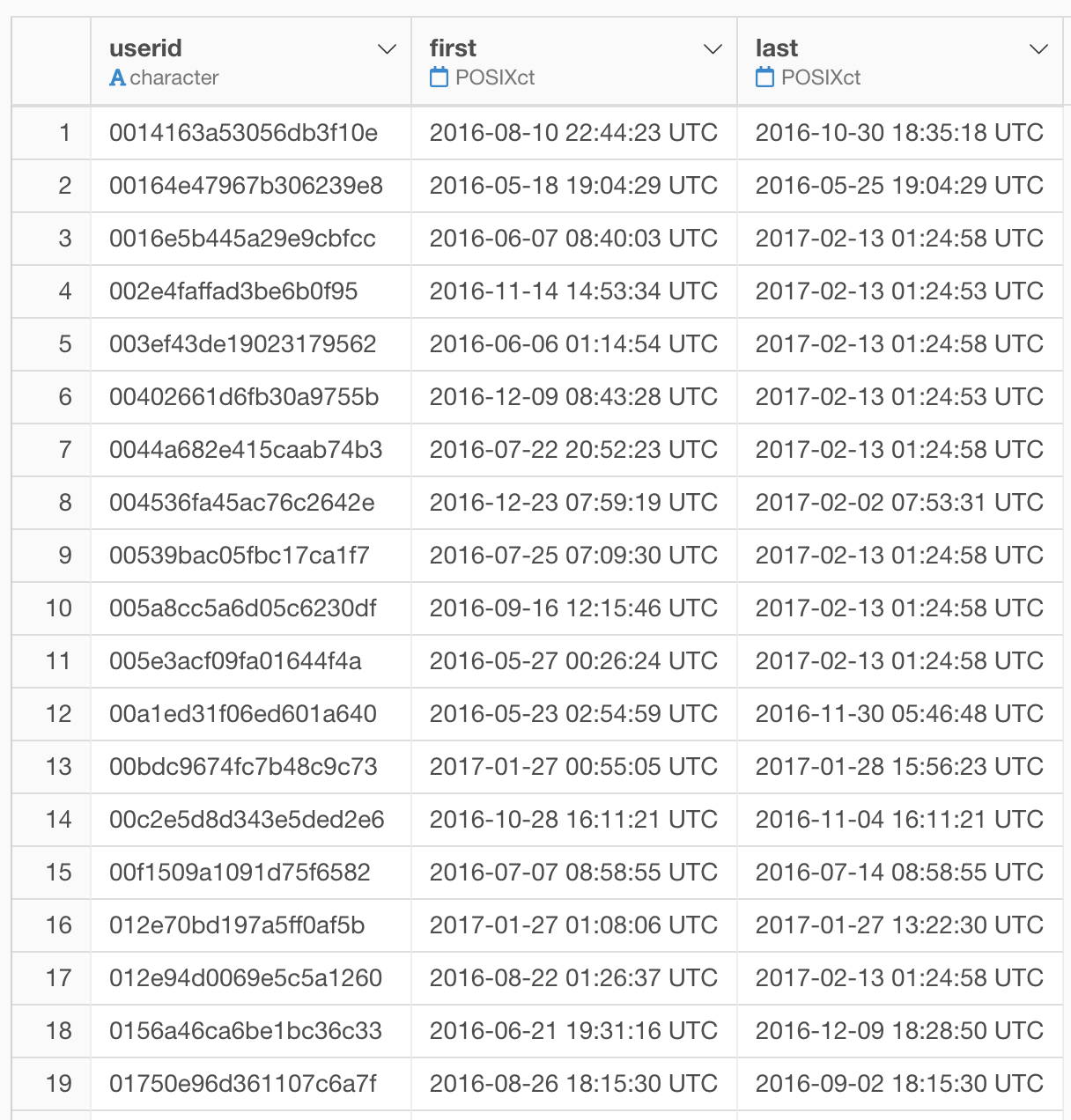 Suppose you have user data in a data frame. Each row represents a user, and each row also has the first and last date/time of access in POSIXct data type.