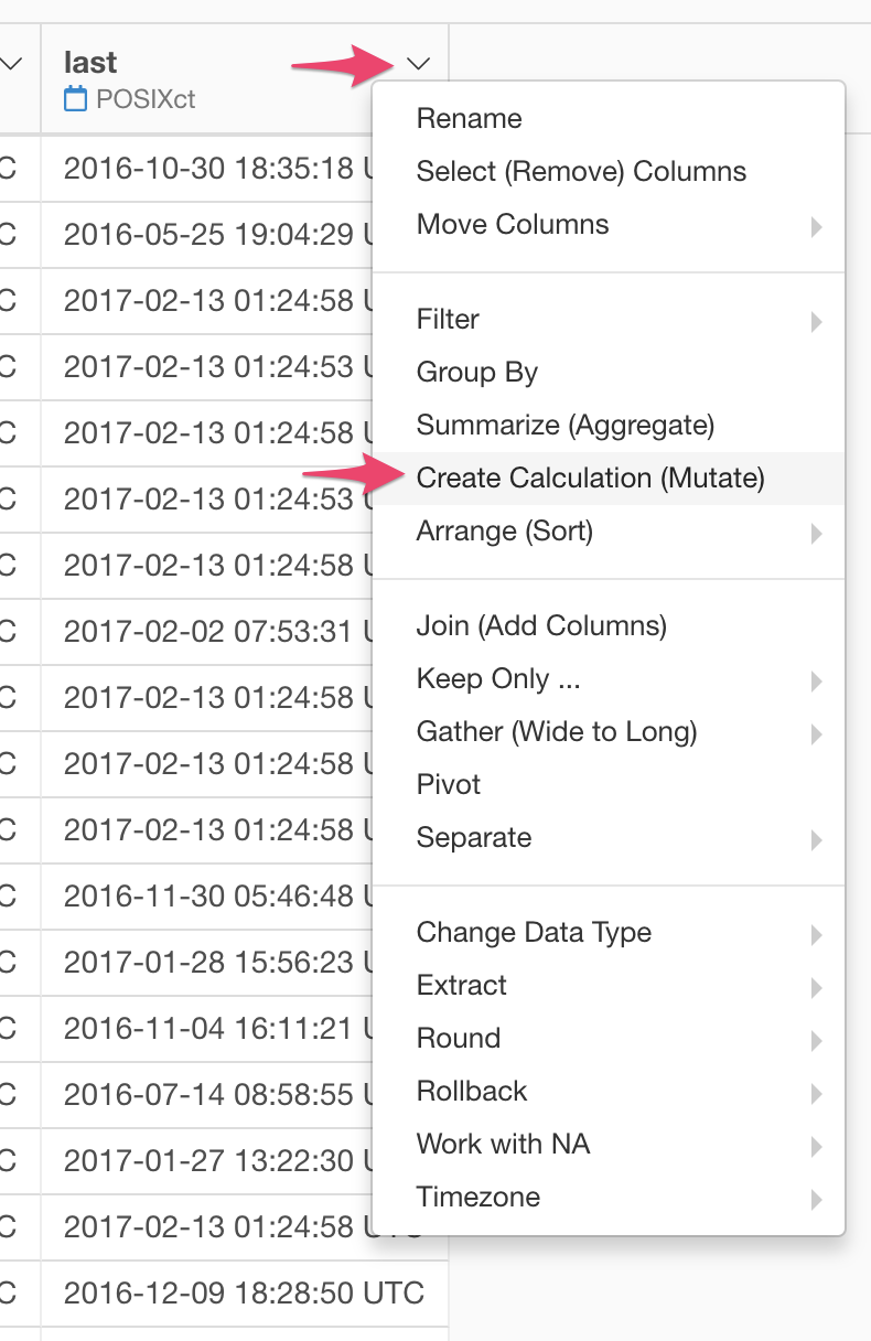 From the column header menu of ‘last’ column, choose ‘Create Calculation (mutate)’.