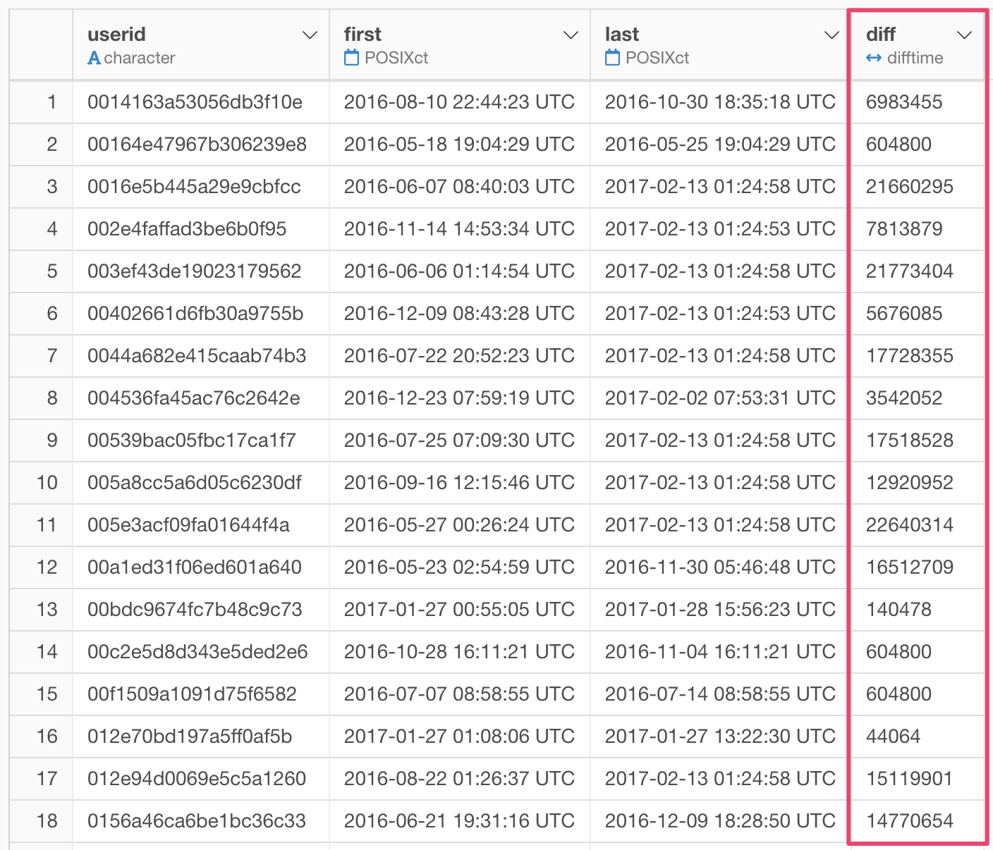 Then, you will see a new column ‘diff’ with number values. Those numbers represent differences in seconds if you compare date/time data (POSIXct data) or differences in days if you compare date data.