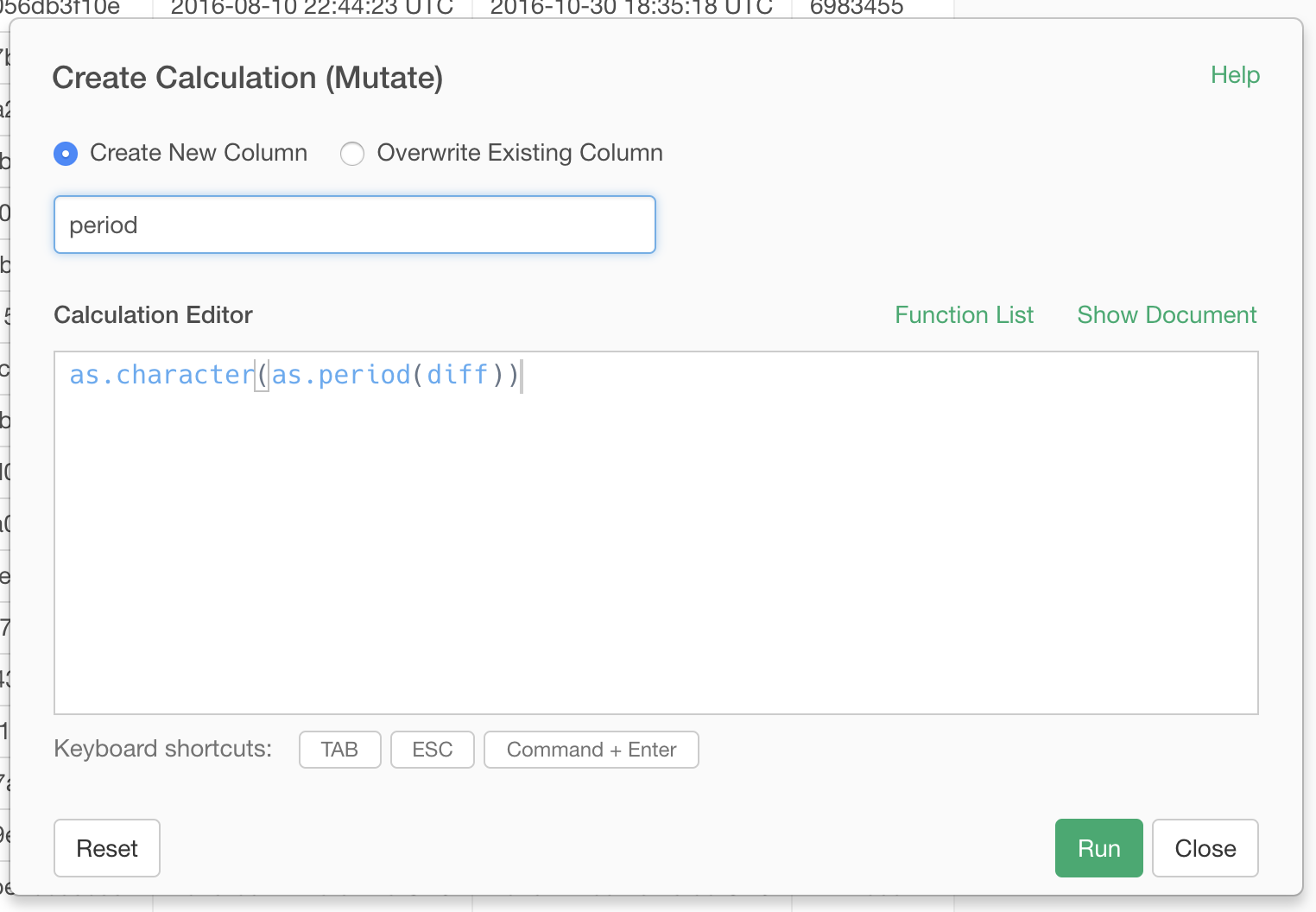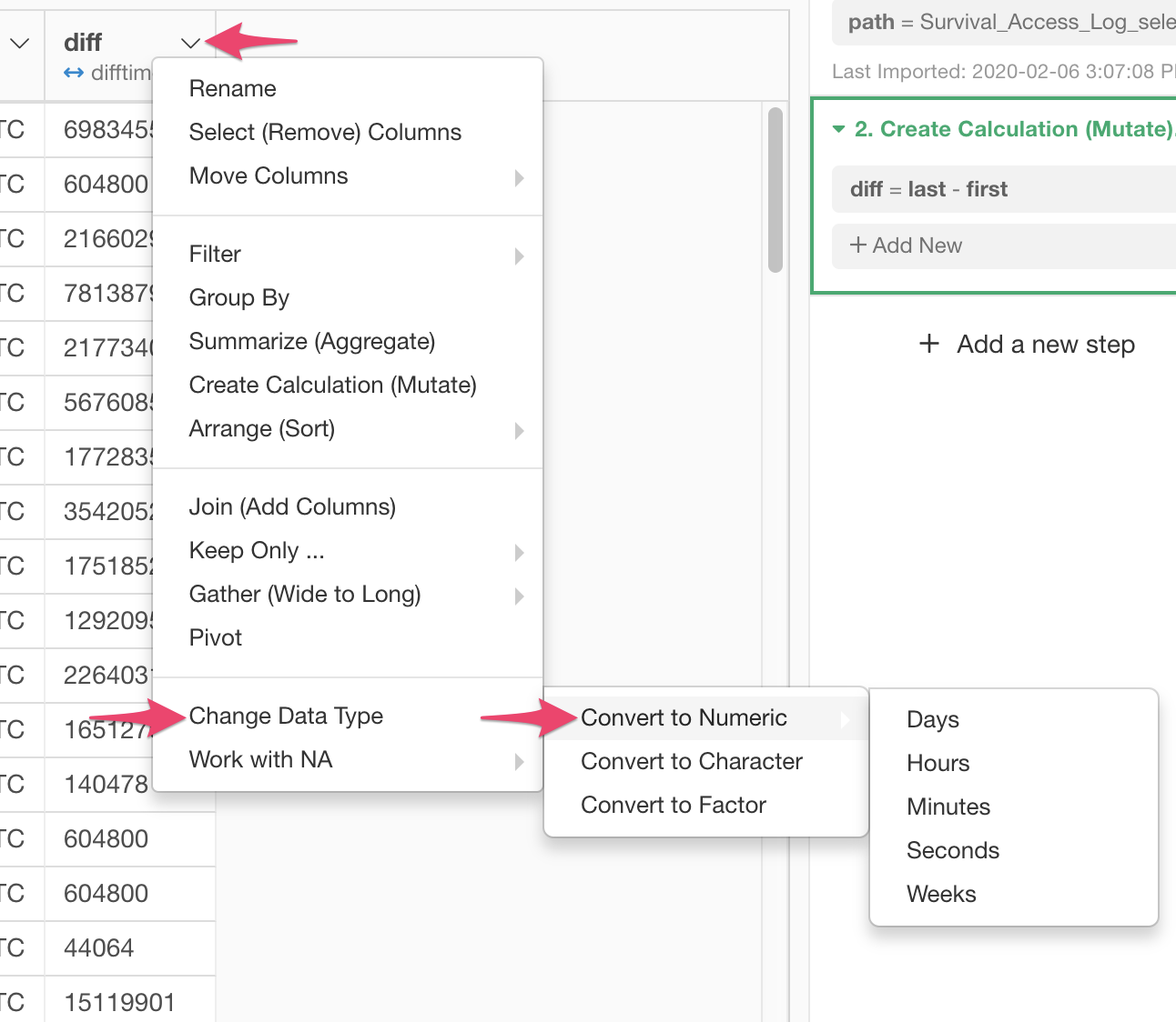 From the column header menu of ‘diff’ column, choose ‘Create Calculation (mutate)’.